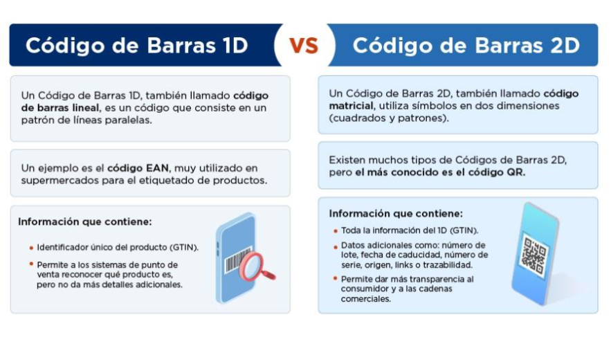 - El Código de Barras 1D (el lineal tradicional) representa el GTIN, el identificador único del producto.